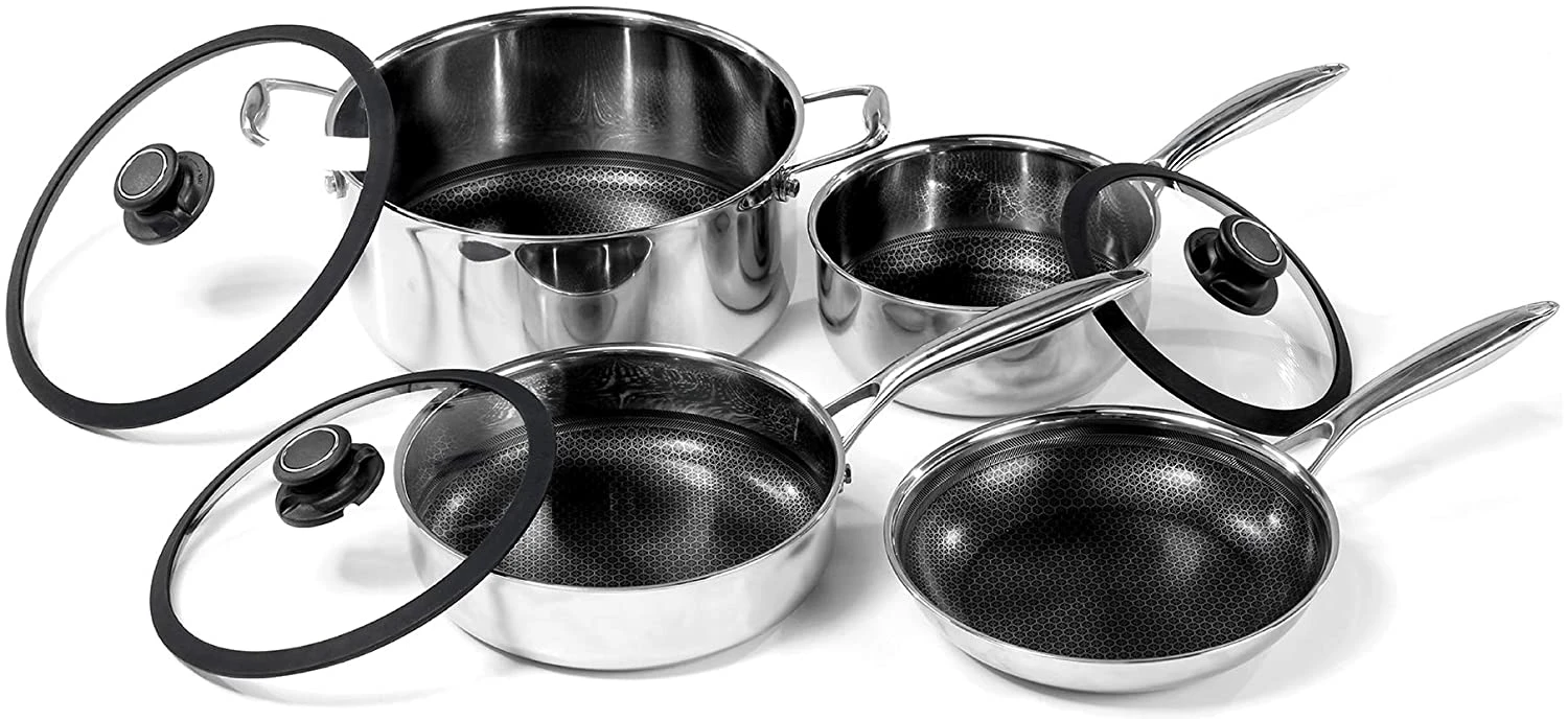 9.5″ Fry Pan, 8″ Sauce Pan with Lid (2.5 qt.), 9.5″ Sauté Pan w/ Lid (3 qt.), 11″ Stockpot with Lid (7.5 qt.)