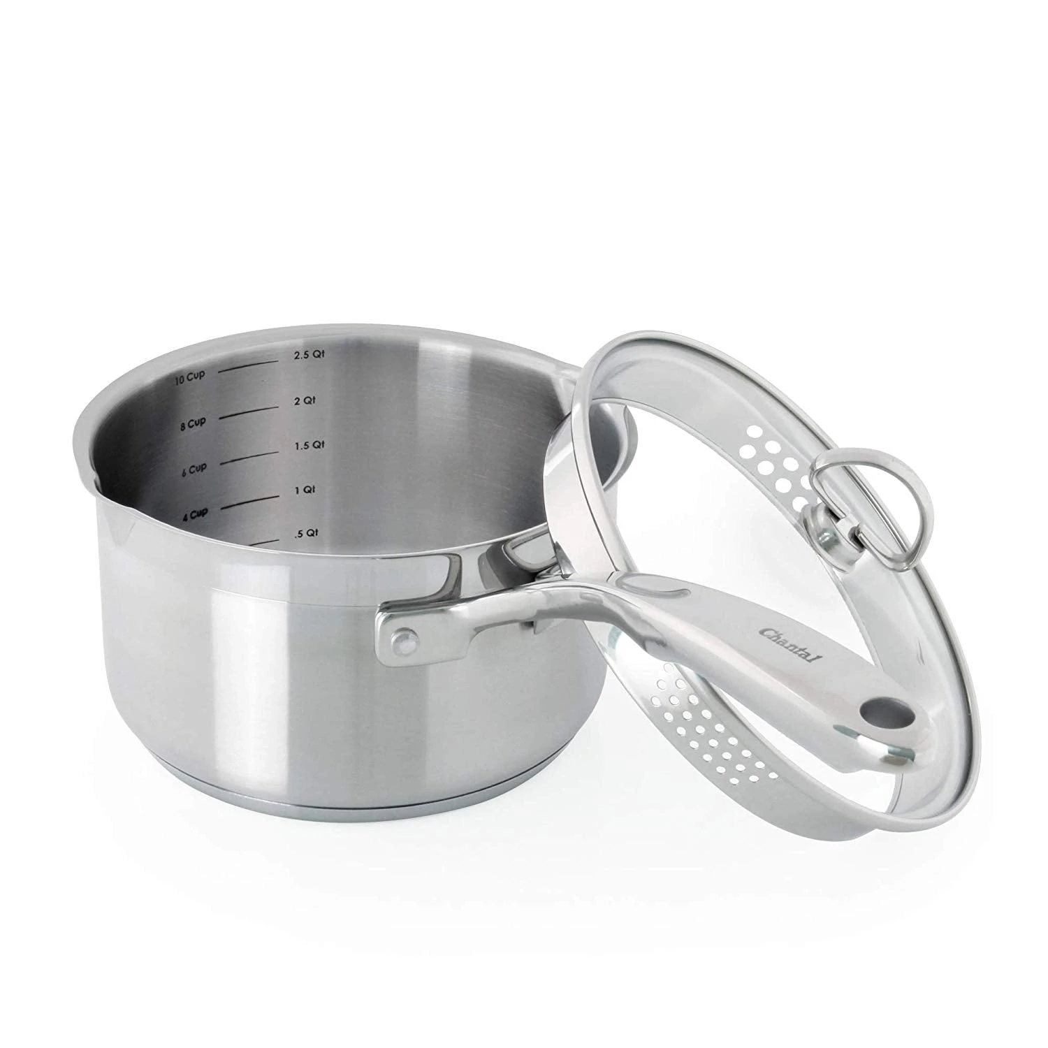 Made from strong Japanese steel, the construction and design of the Induction 21 Steel® cookware line guarantee superior quality. Each piece has copper melted into the steel, which effortlessly conducts heat quickly and evenly. Titanium is also added for strength and durability to endure everyday cooking. This specialty saucepan features a tempered-glass lid with built in strainer. The strainer has two different sizes of holes making it perfect for easily removing liquid after boiling vegetables or pasta. The rim has pouring spouts on both sides so it is comfortable for both left and right handed people. The interior of the pot has fill lines for extra convenience. Total capacity is 2.5 qt capacity.