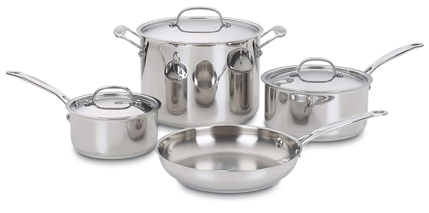 1.5 Qt. saucepan with cover, 3 Qt. saucepan with cover, 8 Qt. stockpot with cover, 10″ skillet