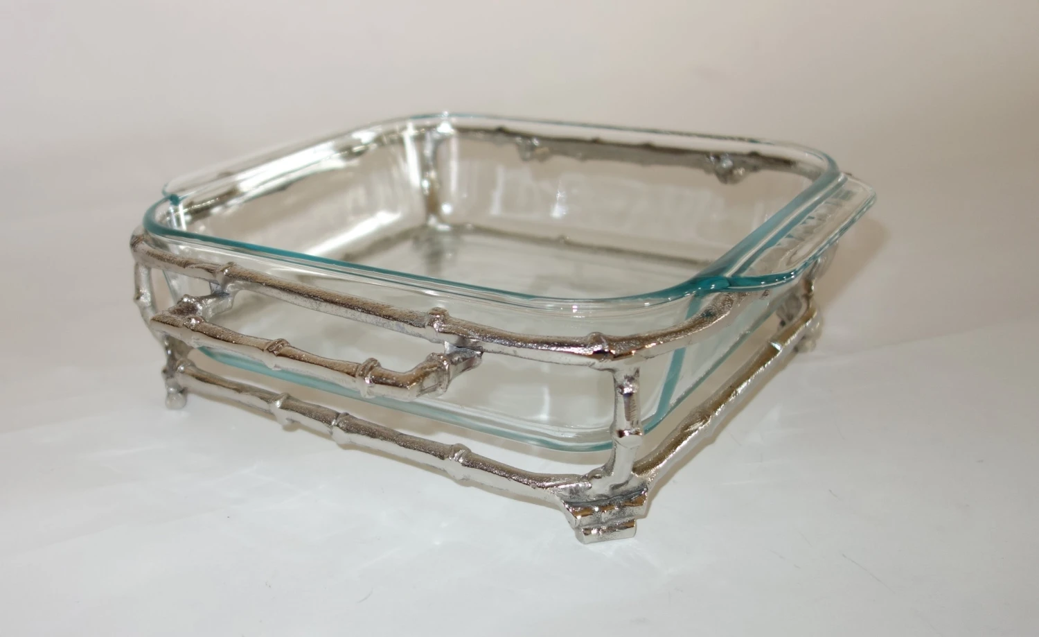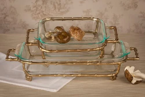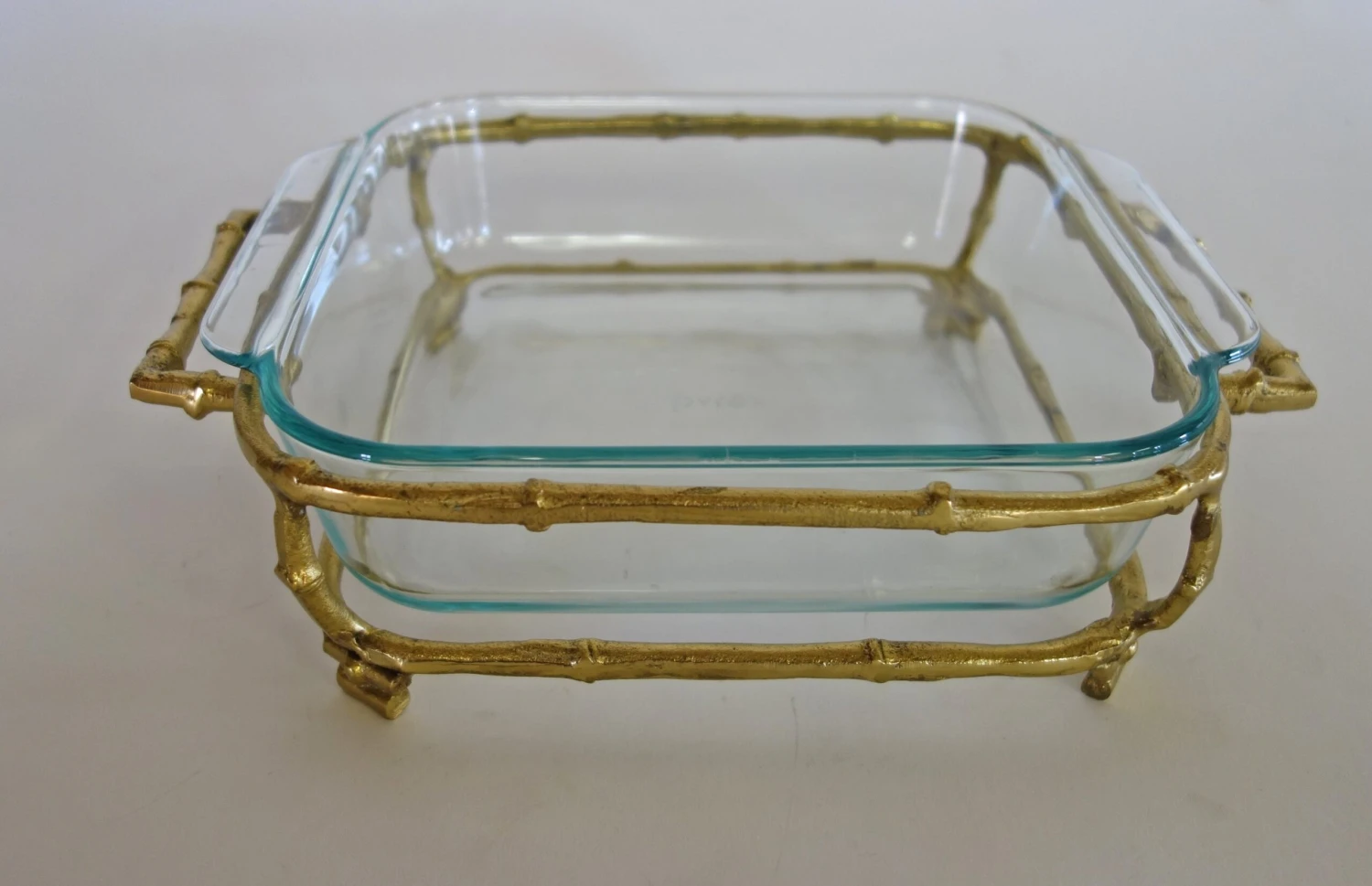 Show off your culinary creations with an elegant flair when you place them before your guests in this beautiful Asian-inspired gold color Bamboo-Look Pyrex Holder. This piece makes an exquisite presentation on your dining table, buffet or countertop. Includes glass baking dish. Pyrex dish made in the U.S.; holder made in India. Glass dish only is dishwasher safe; metal holder can be wiped clean with damp cloth. Pyrex dish is oven safe to 450 F.