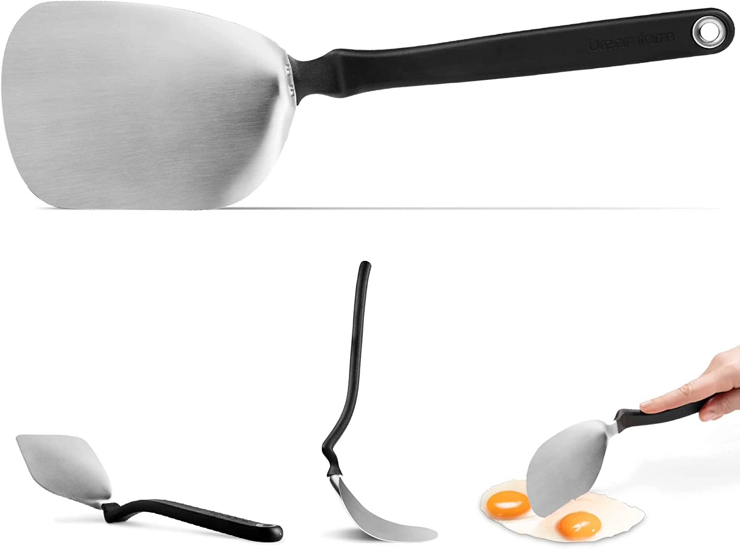 - Chopping and flipping has never been easier! The flexible head allows you to slide it under food with ease for a clean lift and flip. The unique head shape will keep your hand away from the heat while you chop food in a hot pan