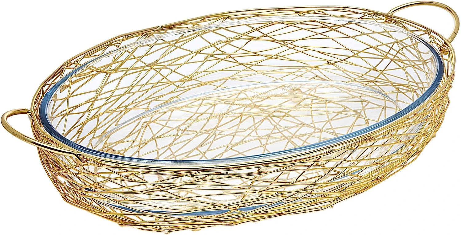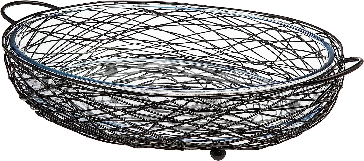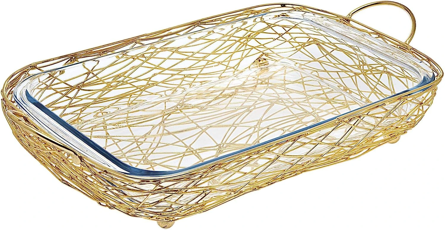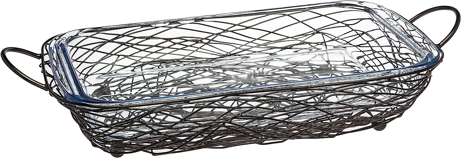 - The elegant rectangular shape of Godinger’s glass baker is accented by an artful finished rack that forms a handsome handled support.