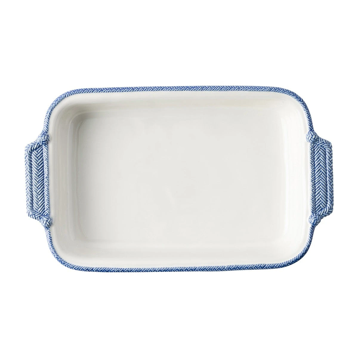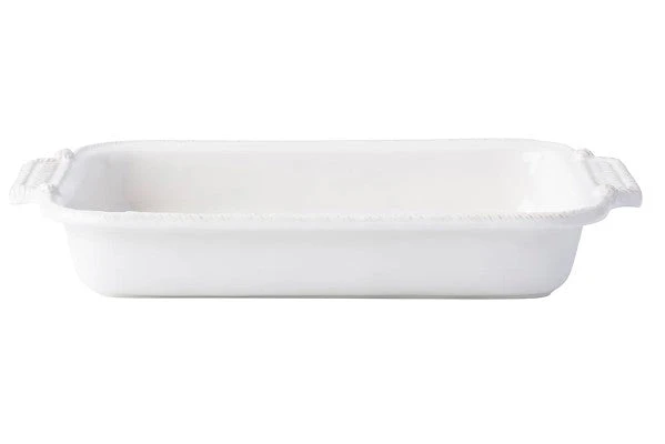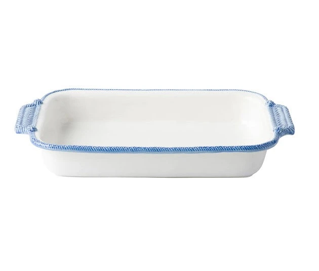 From the Le Panier Collection- The windswept delft blue braided border on this large baking dish is reminiscent of nautical traditions. The pair of pretty handles helps serve up rustic refinement in spades to pair with your legendary cherry lattice slab pie to treat a crowd.
