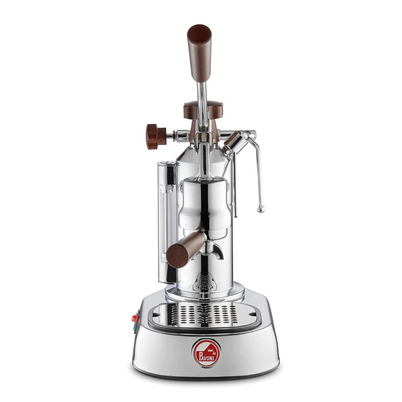 Hand-made with the finest materials this is an iconic work of art. Chromed metal base, 8 cup capacity, wood accents. Makes 1 or 2 cups at a time, internal thermostat and reset fuse. Steam wand and additional cappuccino automatic frother on the chromed base models. Reset button, ETL certified. Gift Boxed. 20oz. boiler capacity