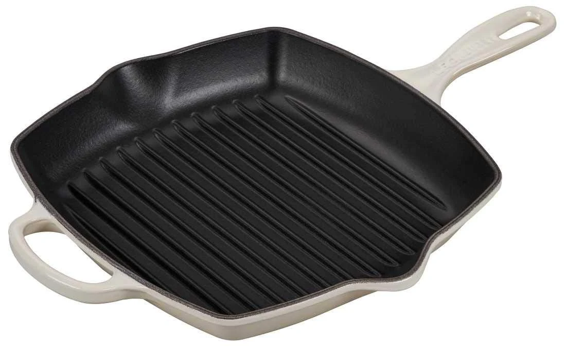 The Square Skillet Grill’s interior is coated with Le Creuset’s protective satin black finish to prevent damage and wear. Over time, this slightly abrasive interior develops a natural patina that is ideal for searing and frying.