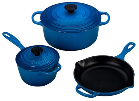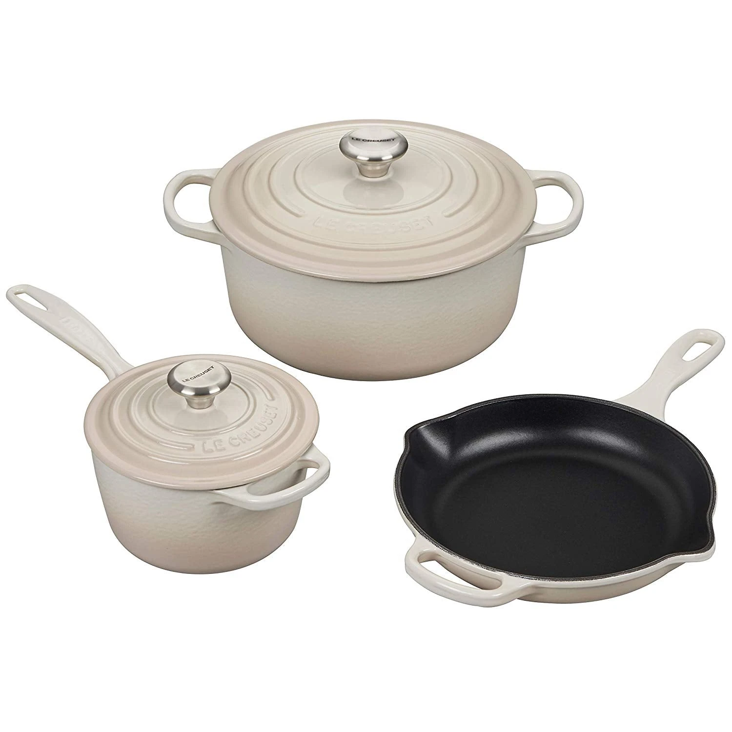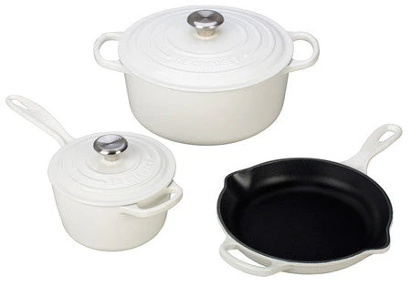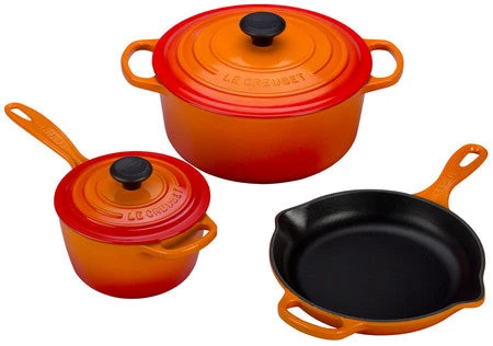 Set includes: 5 1/2 qt. round Dutch oven, 1 3/4 qt. Signature saucepan and 9″ Signature skillet.