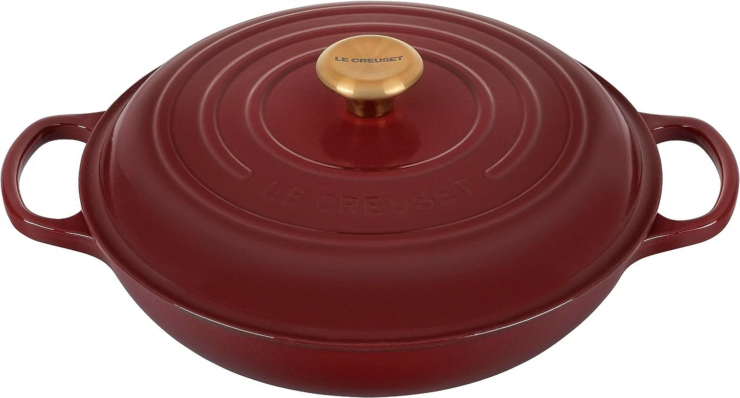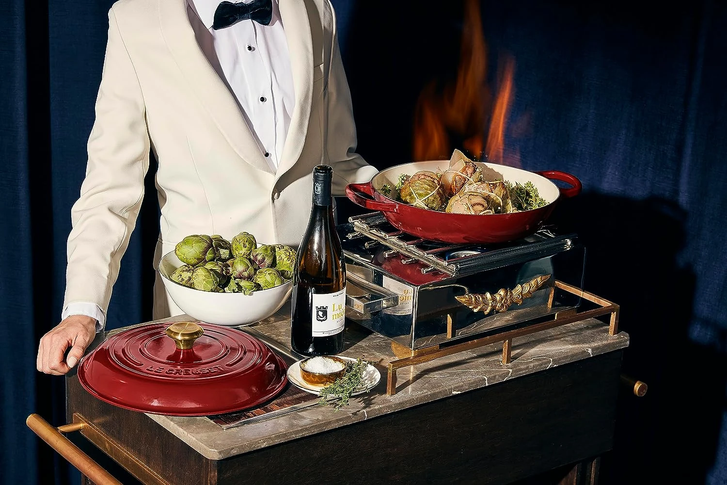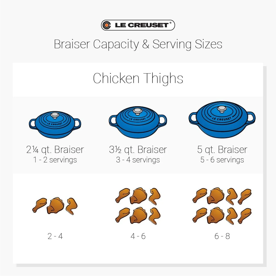 The enameled cast iron braiser is uniquely designed for maximum performance, transforming tough cuts of meat and hearty vegetables into tender, flavorful dishes. Food is first seared over high heat, then finished slowly in a flavorful liquid. The wide base of the braiser allows ingredients to be placed in a single layer for proper searing; once liquid is added, the domed lid continuously circulates steam to lock in moisture and flavor.