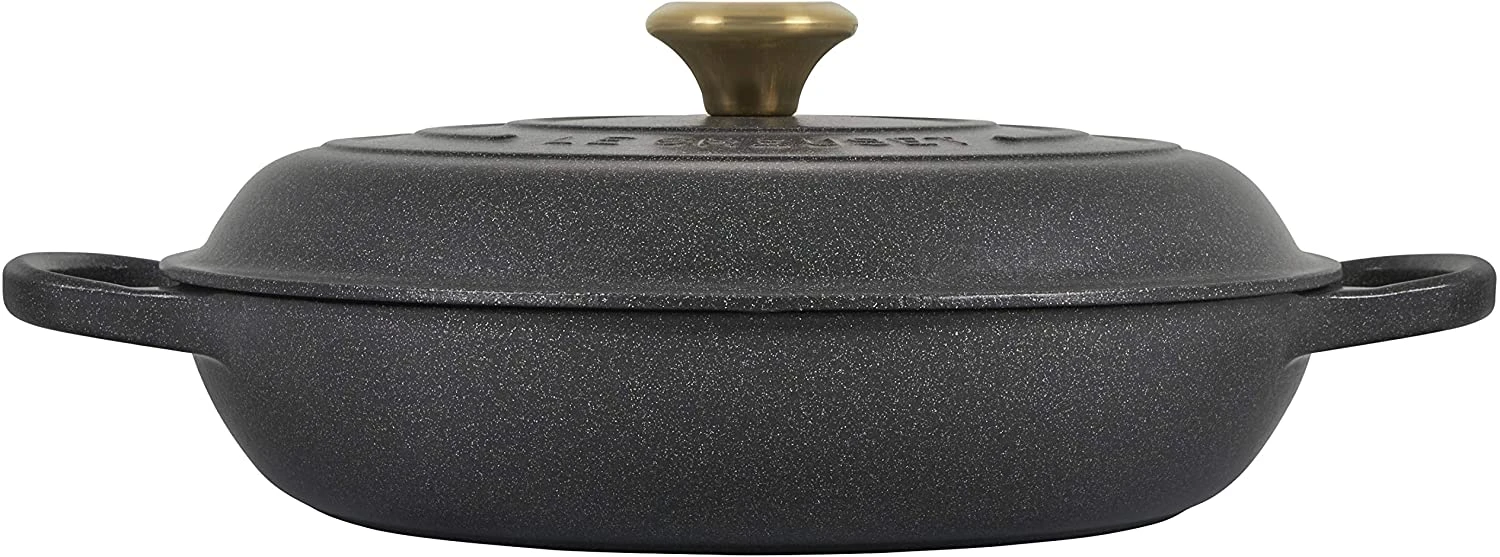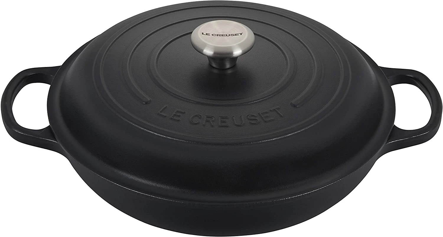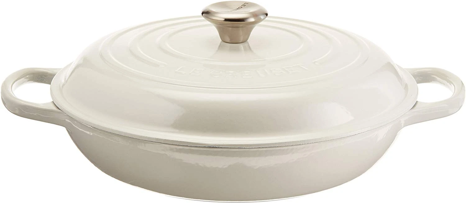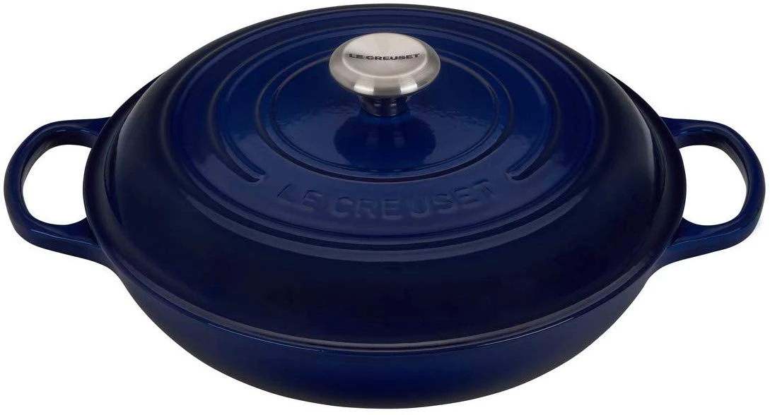 The enameled cast iron braiser is uniquely designed for maximum performance, transforming tough cuts of meat and hearty vegetables into tender, flavorful dishes. Food is first seared over high heat, then finished slowly in a flavorful liquid. The wide base of the braiser allows ingredients to be placed in a single layer for proper searing; once liquid is added, the domed lid continuously circulates steam to lock in moisture and flavor.