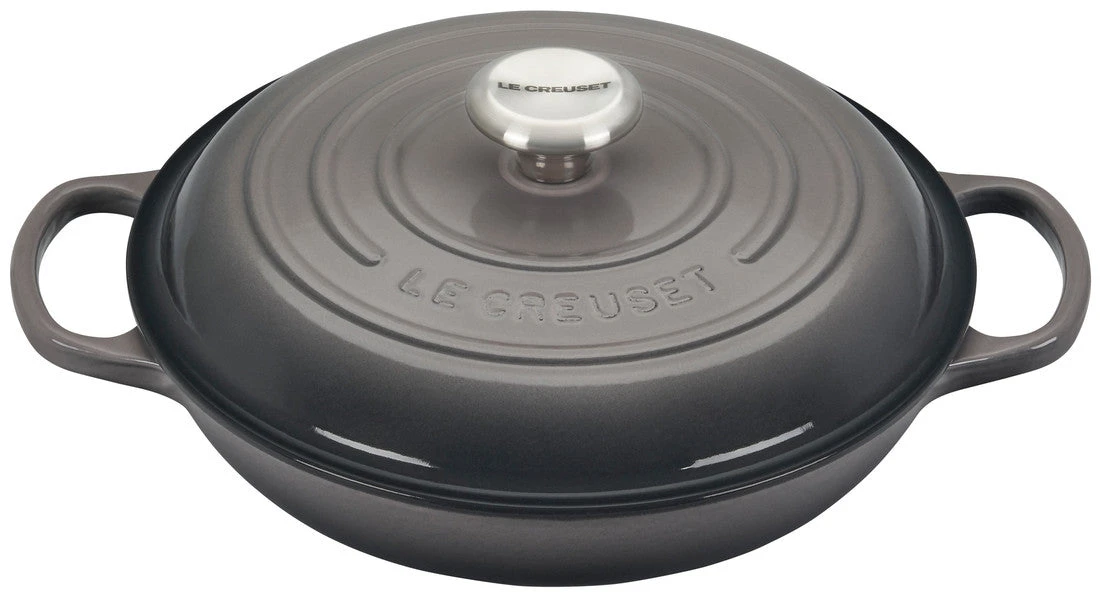 The enameled cast iron braiser is uniquely designed for maximum performance, transforming tough cuts of meat and hearty vegetables into tender, flavorful dishes. Food is first seared over high heat, then finished slowly in a flavorful liquid. The wide base of the braiser allows ingredients to be placed in a single layer for proper searing; once liquid is added, the domed lid continuously circulates steam to lock in moisture and flavor.