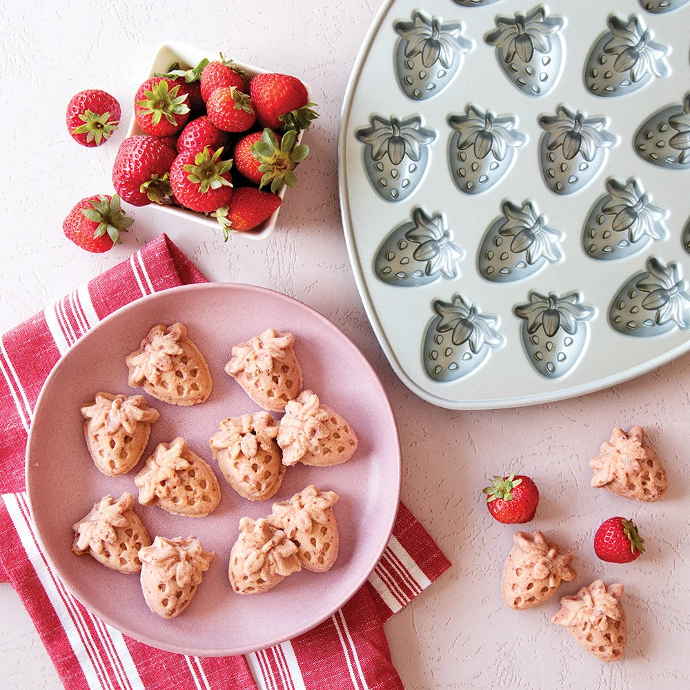 Wild and sweet berries adorn this fanciful plaque. Some fruitful ideas: dip pink strawberry bites in dark chocolate, drizzle vanilla bites with glaze or sandwich two halves with frosting to make a plump whole.