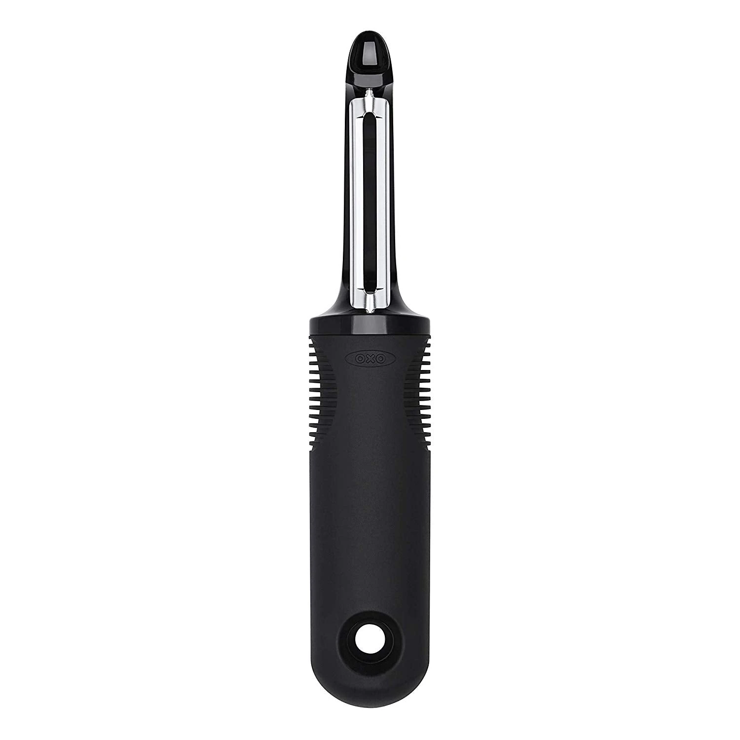 The award-winning OXO Good Grips Swivel Peeler is engineered to stay comfortable through fast, repetitive use. It’s perfect for prepping tough-skinned fruits and vegetables like apples and cucumbers. Two sharp, Japanese stainless steel blades flex to peel large areas with each stroke. The easy-grip handle is designed to work for lefties and righties, and it stays non-slip, even when wet. A durable, built-in potato eyer carves out blemishes without ruining your produce. The handle includes a hole for hanging storage.