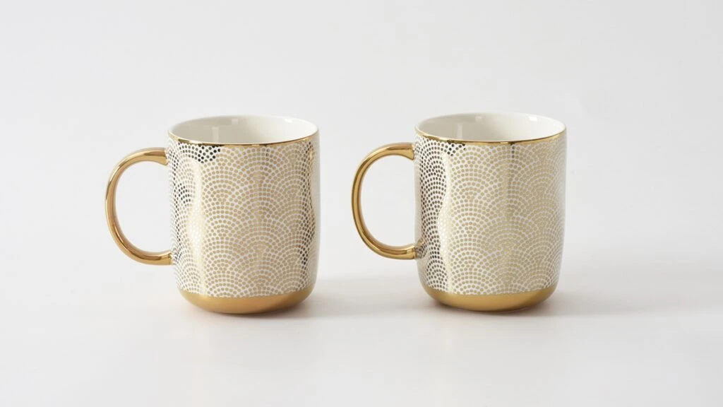 Set of 2 Dotted Mugs are beautifully crafted in a stunning white porcelain with gold detail. Inspired by the beauty and unique shape of the Japanese folding fan called Sensu. Great for fancy dinners or everyday meals. Use for a fabulous brunch or delight guest by serving their after dinner coffee in this gorgeous mug!?Beautifully packed in a gift box, with a fun sentiment on the cover that can be personalized. 16 oz. capacity