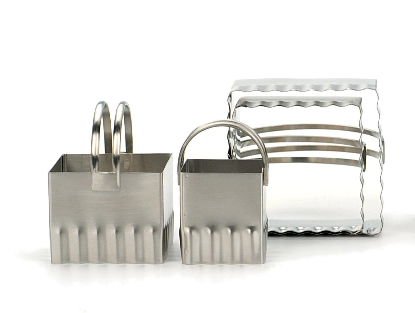 Our biscuit cutters feature 18/10 stainless steel construction with comfortable arched handles and thin blades that cut through thick or thin dough. The Set of 4 cutters nest together for easy storing and are dishwasher safe. Choose from our round or square in straight or rippled edges