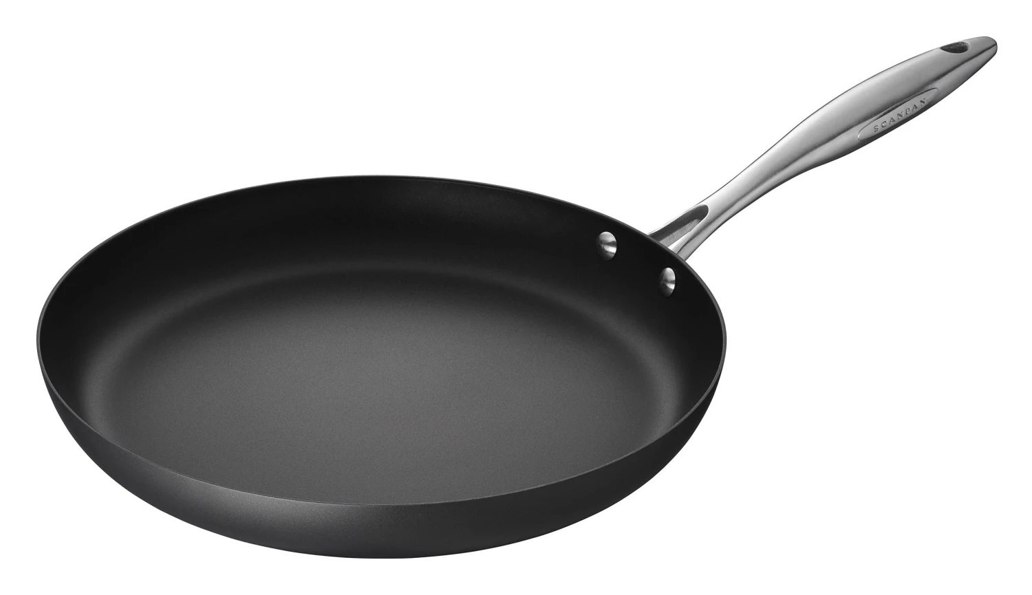 Cast 18/10 stainless handles stay cool longer. Heavy-duty stainless steel rivets permanently secure handles to pan body