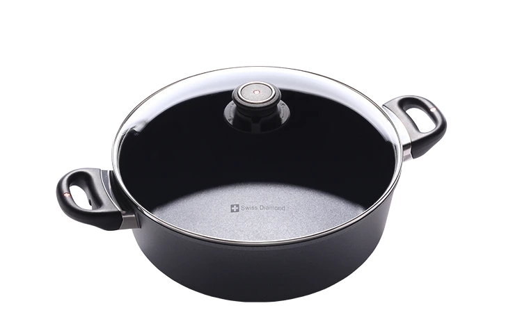 Swiss quality defines our products. With similar proportions to a Dutch oven, the Swiss Diamond 11 inch Braiser is approximately 3.5 inch deep with a 5.3-quart cooking capacity – ideal for pot roast, goulash, ratatouille, Irish stew, and more! Thick cast aluminum construction guarantees zero warping and even heat distribution. Take the Braiser from stovetop to oven to table as all Swiss Diamond cookware is oven-safe up to 500°F (260°C). The heat-tempered glass lid allows you to closely monitor your food as it cooks and features an adjustable steam vent for advanced moisture control. Suitable for use on gas and electric stoves – for the induction version, please visit our Induction Collection.
