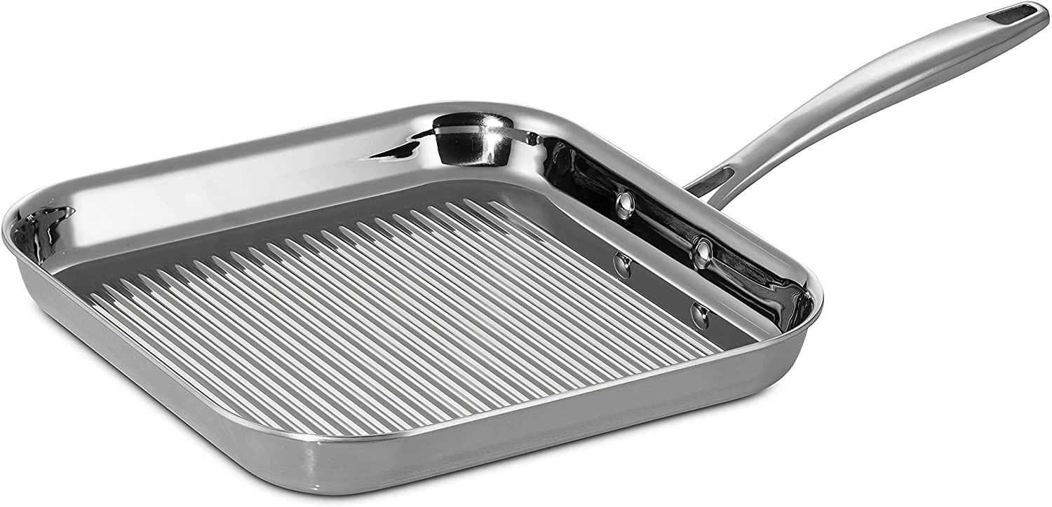 The tri-ply clad grill pan is made of premium 18/10 stainless steel, an aluminum core layer, and a layer of magnetic stainless steel. The construction means the grill pan heats evenly throughout – not just the bottom. Designed to withstand repeated usage even in the most demanding kitchens, it also features a stainless steel ergonomic handle riveted for additional support and easy maneuvering. The grill pan is compatible with all cooktops, including induction, and is oven-safe up to 500°F / 260°C.