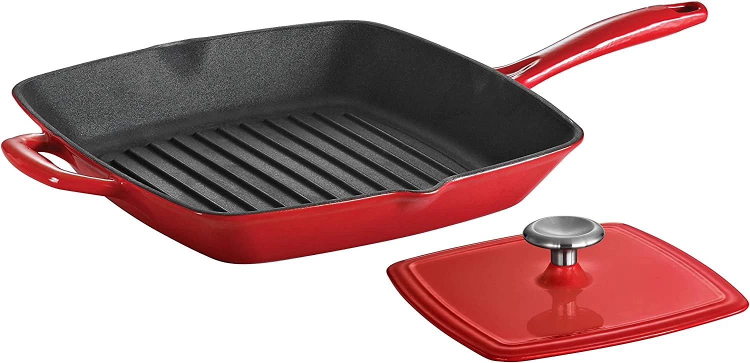 - PFOA and PTFE-free porcelain enamel ribbed cooking surface is non-reactive and easy-to-clean, lifting foods from grease for healthier cooking